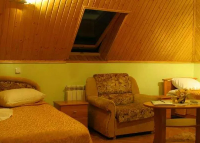 Трьохповерхова будівля з цоколем, в якому розташована фінська сауна з басейном на 12 м3 та зоною відпочинку, WC, котельня з пральнею, склад та гараж. Комфортабельні готельні номери, які можуть вмістити мін. 20 осіб.